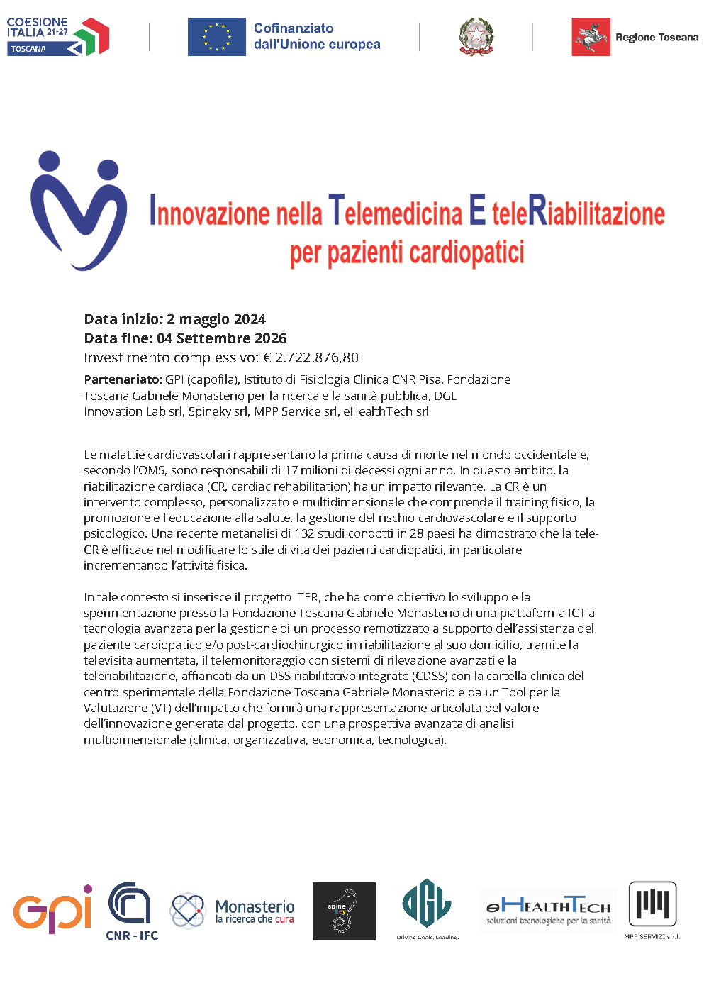 In tale contesto il progetto ITER ha come obiettivo lo sviluppo e la sperimentazione presso l'Ospedale del Cuore della Fondazione Toscana Gabriele Monasterio di una piattaforma ICT, dispositivo medico, a tecnologia avanzata (POHEMA) per la gestione di un processo remotizzato a supporto della gestione del paziente cardiopatico e/o post-cardiochirurgico, adulto e pediatrico, in riabilitazione al suo domicilio e fornira' strumenti innovativi quali: